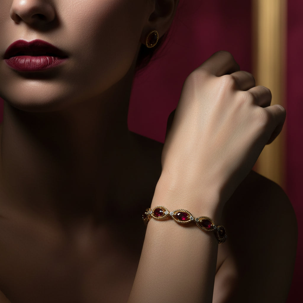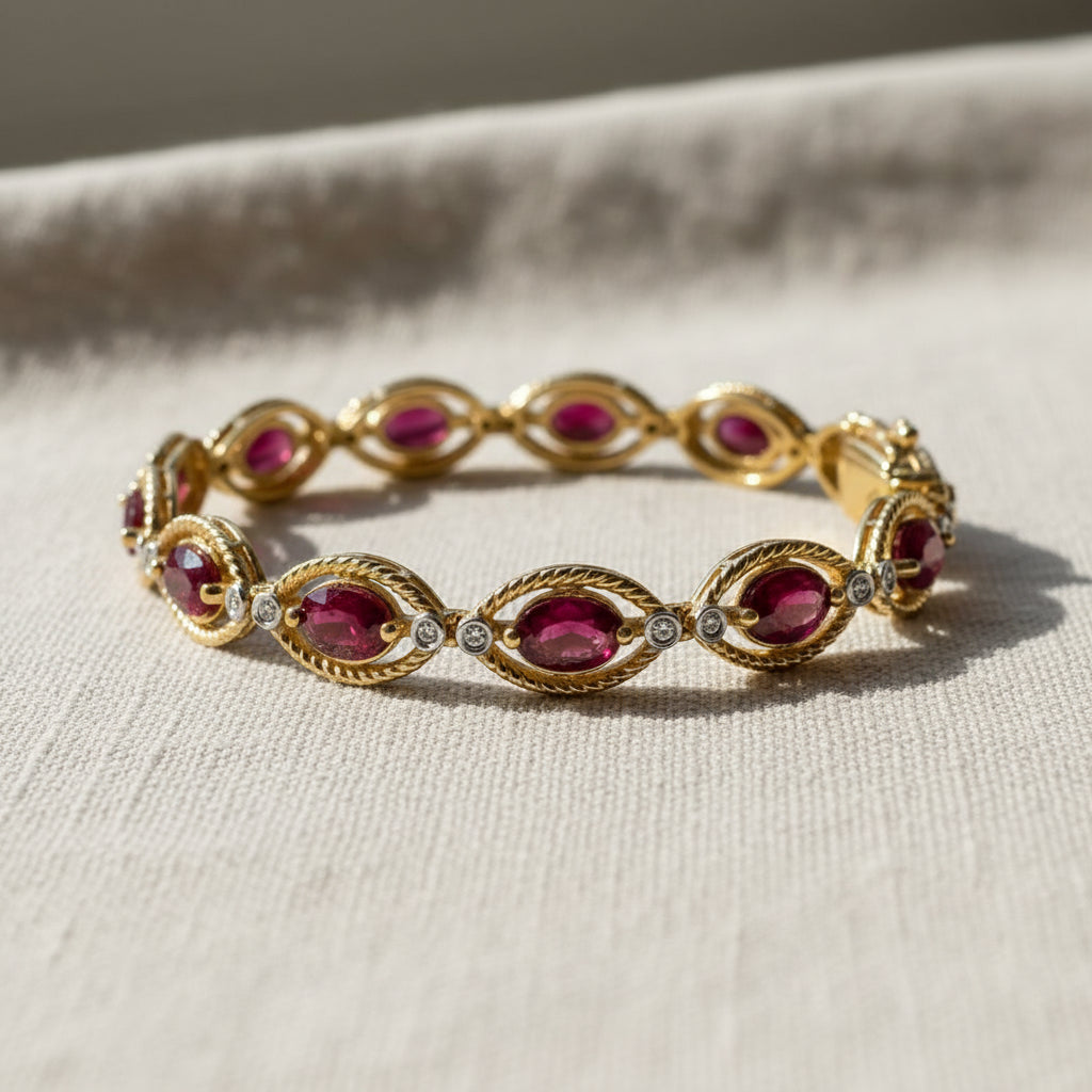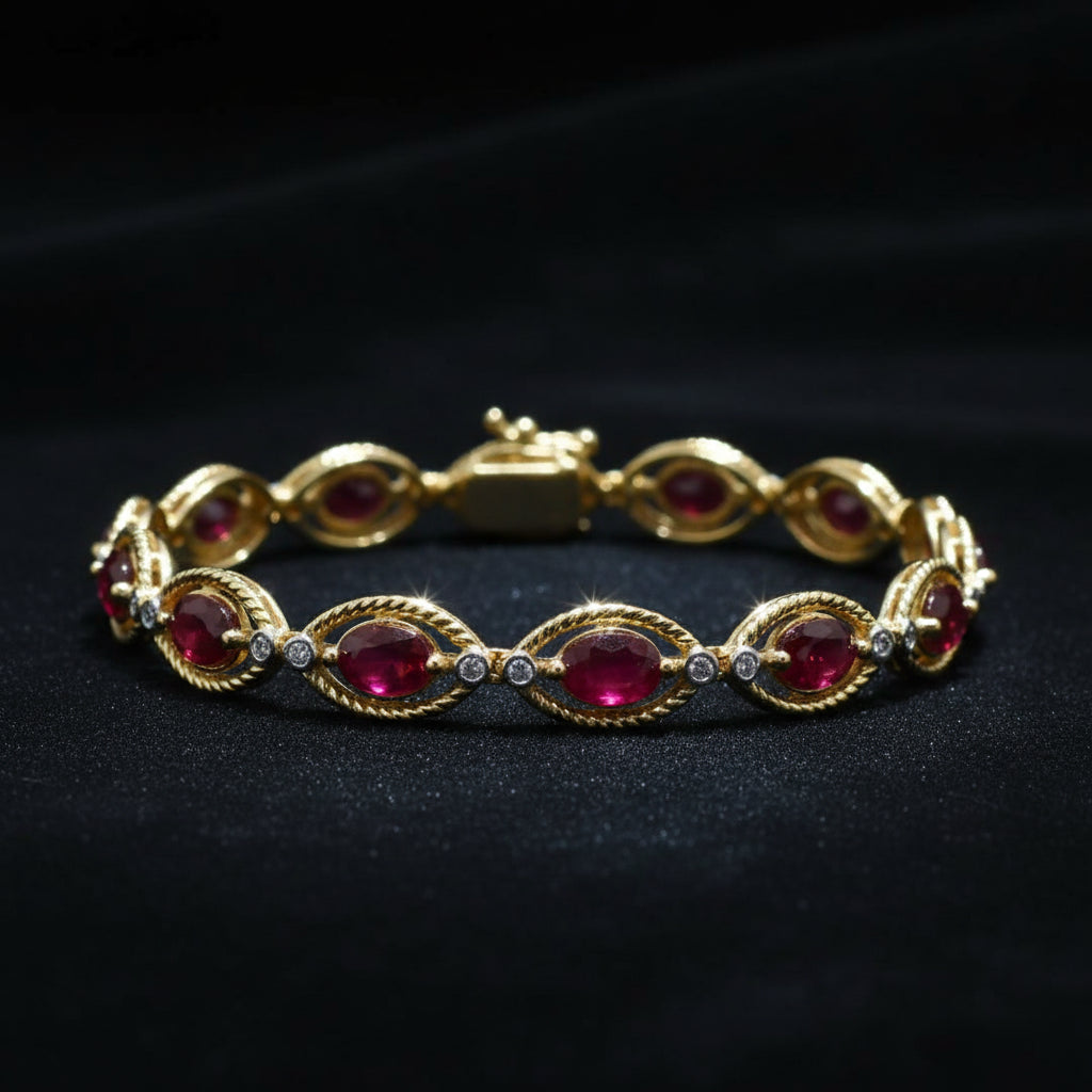 Bracelet en or jaune 14 carats avec diamants et rubis taille marquis de 9,7 carats
